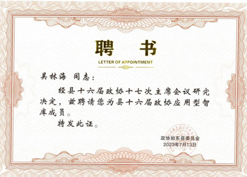 我所主任會(huì)計(jì)師吳林海同志被政協(xié)如東縣委員會(huì)2023713聘為縣十六屆政協(xié)應(yīng)用型智庫(kù)成員。