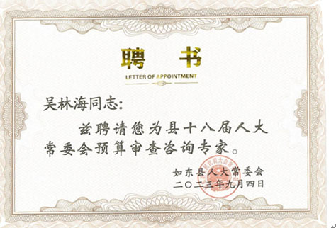 被聘為如東縣人大常委會(huì)202394聘為縣十八屆人大常委會(huì)預(yù)算審查咨詢專家。
